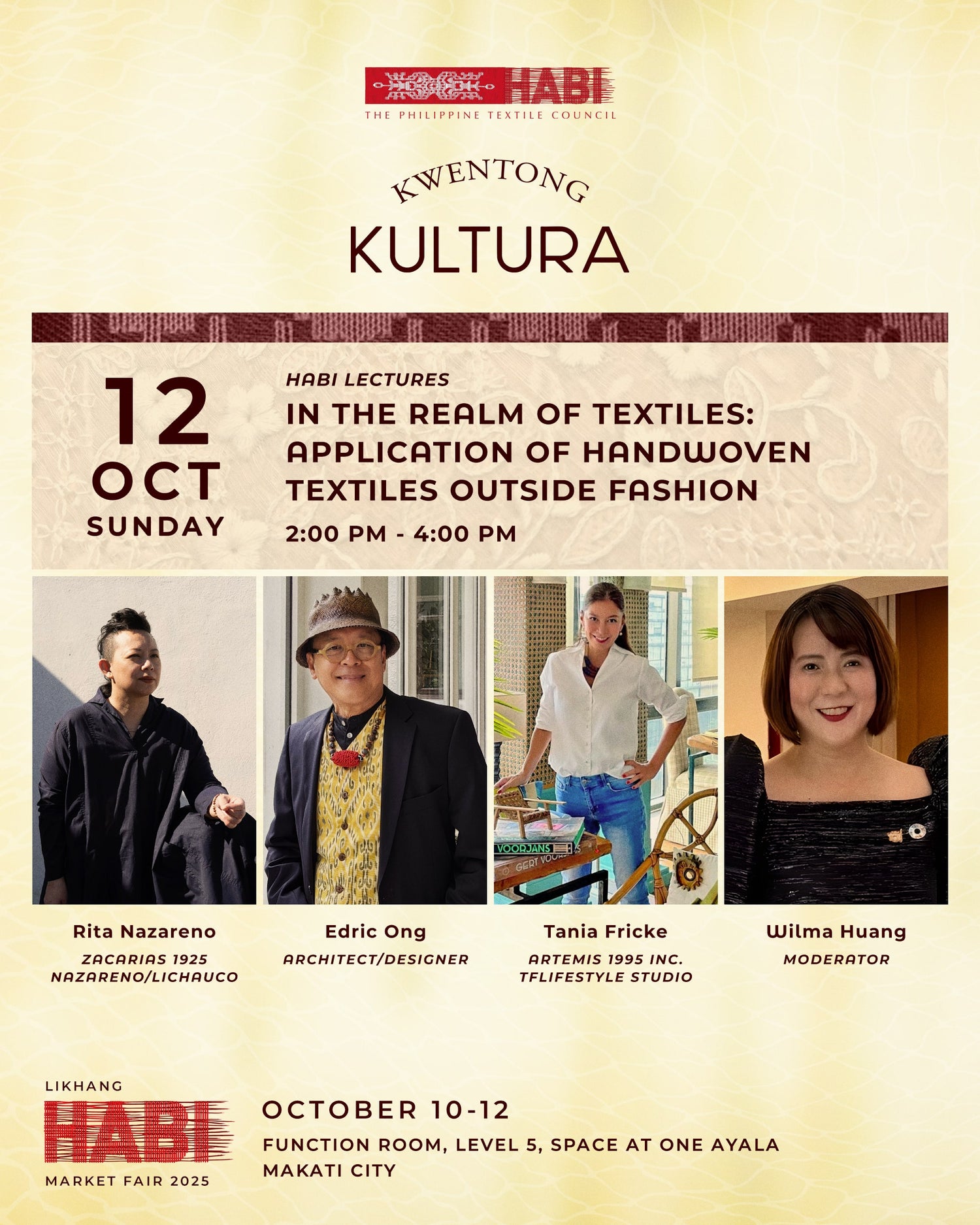 On the final day (October 13), focus turns to ZACARIAS1925 creative director Rita Nazareno, ASEAN Handicraft Promotion and Development Association (AHPADA) president Edric Ong, and lifestyle consultant Tanya Fricke. HABI advocate and Museo Pambata President Wilma Huang will be moderating the discussion.